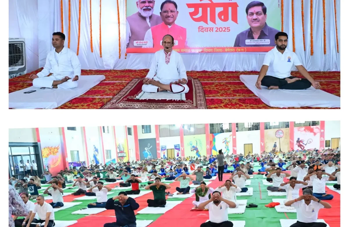 ट्राई सिटी एक्सप्रेस। न्यूज बेमेतरा। ग्यारहवें अंतर्राष्ट्रीय योग दिवस के अवसर पर आज प्रातःकाल जिला मुख्यालय स्थित स्वामी विवेकानंद स्टेडियम (कंतेली), बेमेतरा में भव्य