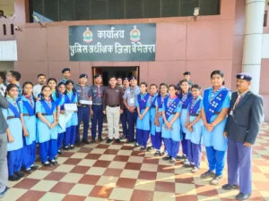 स्काउट गाइड के बच्चों एवं शिक्षकों ने एसएसपी बेमेतरा रामकृष्ण साहू से सौजन्य भेंट की एवं उन्हें स्काउट गाइड का फ्लैग लगाया