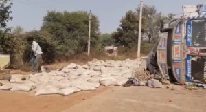 सीमेंट से भरा ट्रक पलटा, गाड़ी प्रथम बाफना की, जो बलौदबाजार से राजनांदगांव जा रही थी