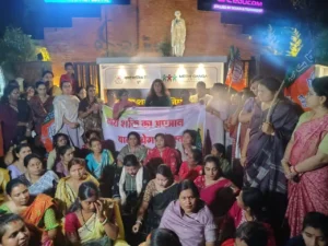 लोकसभा में प्रधानमंत्री नरेंद्र मोदी के नेतृत्व वाली सरकार के द्वारा नारी शक्ति वंदन अधिनियम लाए जाने पर विपक्षी पार्टियों के द्वारा अधिनियम के विरुद्ध वोटिंग करने के कारण अधिनियम पारित न हो पाया जिसके विरोध स्वरूप भारतीय जनता पार्टी की राष्ट्रीय उपाध्यक्ष सरोज पाण्डेय की मुख्य उपस्थिति में एवं जिला भाजपा अध्यक्ष सुरेंद्र कौशिक के मार्गदर्शन में दुर्ग के हिंदी भवन के पास महात्मा गांधी पुतले के समक्ष रात्रि 9:00 बजे अपना विरोध प्रदर्शन कर अपना आक्रोश जताया इस अवसर पर महापौर अलका बाघमार, भाजपा प्रदेश कार्य समिति सदस्य उषा टावरी, चंद्रिका चंद्राकर, भिलाई जिला अध्यक्ष पुरुषोत्तम देवांगन, जिला महामंत्री दिलीप साहू, विनोद अरोरा, सुषमा जेठानी,जिला उपाध्यक्ष सरिता मिश्रा, मंत्री गायत्री वर्मा,महिला मोर्चा प्रदेश मंत्री कुमुद बघेल, जिला अध्यक्ष तृप्ति चंद्राकर ,स्वीटी कौशिक उपस्थित रहे |आयोजित विरोध प्रदर्शन में महिलाओं ने कांग्रेस सहित समस्त विपक्षी पार्टियों को महिला विरोधी बताते हुए जमकर नारेबाजी की और अपना आक्रोश दर्ज कराया|