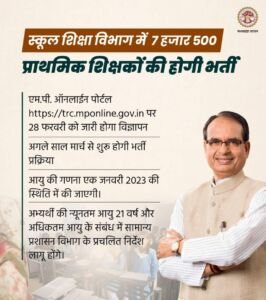 स्कूल शिक्षा विभाग प्रदेश में 7500 प्राथमिक शिक्षकों की भर्ती करेगा। अकादमिक-सत्र वर्ष 2023-24 के लिए विभाग द्वारा पदों का विस्तृत विवरण, नियम, निर्देश, प्रक्रिया, आरक्षण अर्हता आदि एम.पी.ऑनलाईन पोर्टल https://trc.mponline.gov.in पर 28 फरवरी 2023 से उपलब्ध रहेगा।