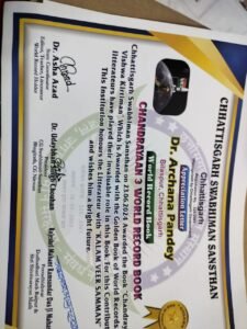 डॉ. अर्चना पाण्डेय ने बिलासपुर छत्तीसगढ़ का मान बढ़या गोल्डन बुक ऑफ वर्ल्ड रिकॉर्ड से सम्मानित हुईं