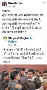 उन्होंने भूपेश बघेल को पोस्ट को लेकर कहा कि क्रांति सेना को लेकर भूपेश बघेल की टिप्पणी से यह स्पष्ट हो गया है कि छत्तीसगढ़ क्रांति सेना कांग्रेस और भूपेश बघेल की बी टीम है। बहरहाल इस पूरे मामले में राजनीति गर्माई हुई है। हालांकि भिलाई शहर के कांग्रेस नेता इस पूरे मामले में चुप्पी साधे हुए हैं। उनके तरफ से खुलकर अब तक कोई बयान सामने नहीं आया है। हालांकि छत्तीसगढि़यां इस मुद्दे को लेकर छत्तीसगढ़ के लोगों में खासी नाराजगी देखी जा रही है। उन्होंने सीधे तौर पर कहा है कि यह छत्तीसगढ़ के लोक कलाकार देवदास बंजारे का अपमान है। पूरे छत्तीसगढ़ और यहां के कलाकारों का अपमान है। वैशालीनगर विधायक को अपना फैसला वापस लेना चाहिए। हालांकि वैशालीनगर विधायक ने कहा है कि उन्हें इस बारे में जानकारी नहीं थी। लेकिन वे अब भी अपने फैसले पर कायम हैं। बता दें कि रिकेश सेन ने बिहार की लोक कलाकार शारदा सिन्हा के निधन के बाद नकटा तालाब जो कि देवदास बंजारे के नाम पर है, उसका नाम बदलकर शारदा सिन्हा के नाम पर करने की घोषणा की है। साथ ही अपनी निधि से 1 करोड़ रुपए तालाब के सौंदर्यीकरण और शारदा सिन्हा की प्रतिमा स्थापित किए जाने के लिए दिए जाने की बात कही थी। इसके बाद से सियासी घमासान तेज हो गया है। रिकेश की घोषणा को लेकर पूरे प्रदेश में तीखी प्रतिक्रिया सामने आई है।  ​