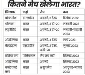 दिसंबर 2022 से लेकर सितंबर 2023 तक टीम इंडिया विदेश में 2 और अपने घर पर 4 सीरीज खेलेगी। इसके अलावा हमें सितंबर 2023 के दौरान पाकिस्तान में एशिया कप भी खेलना है। जो वनडे वर्ल्ड कप के चलते इस बार 50 ओवर का होगा।